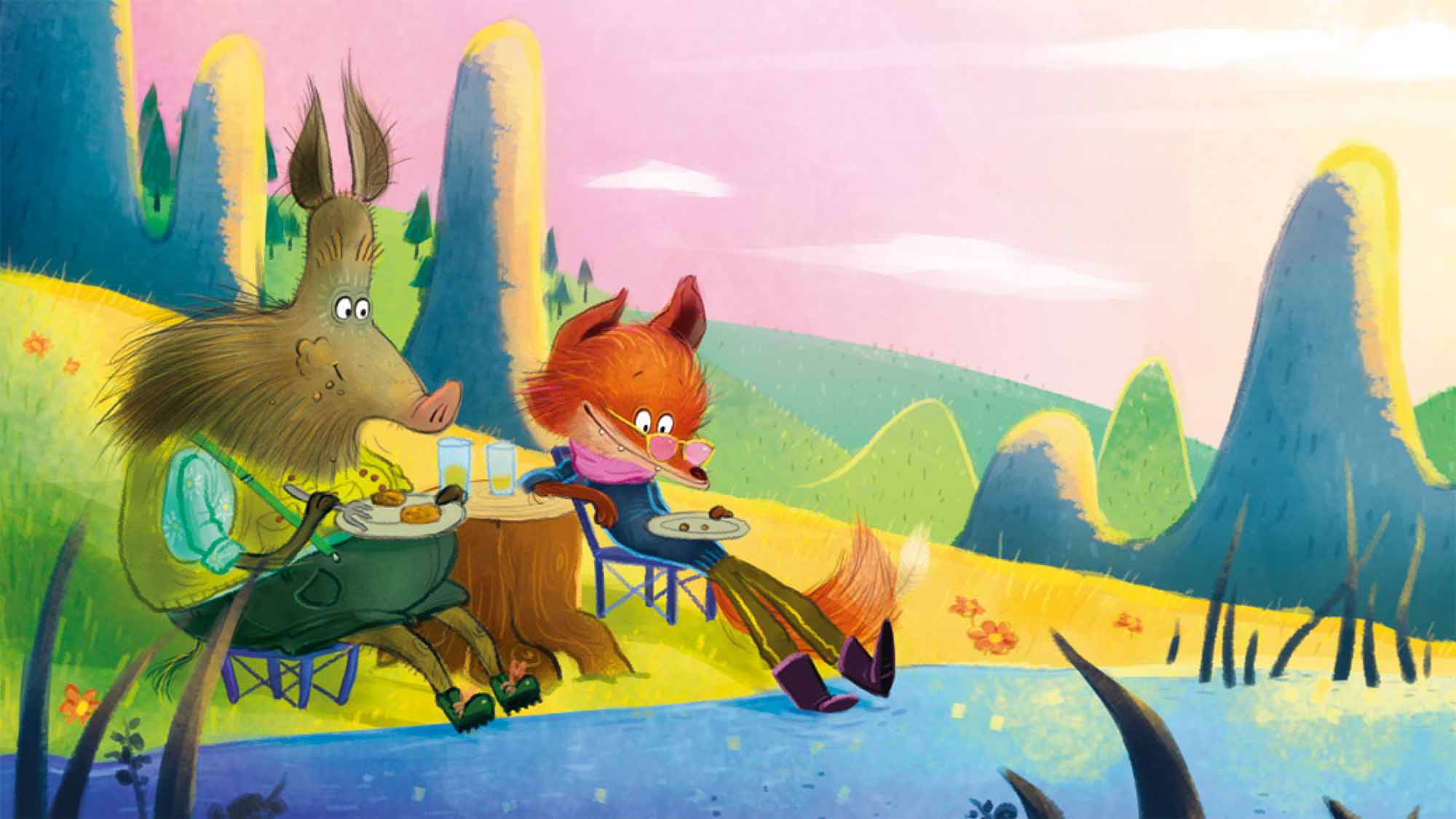 The fox and the wild boar are sitting by their lake as every day. Yet today, they encounter a day-fly as it hatches. The fly is tough, smart and funny, but her life is so short! To explain his sadness, the wild boar hastily claims that the fox is the one who has only one day to live. The day-fly then comes up with a magnificent plan: to give the fox the best day of his life.